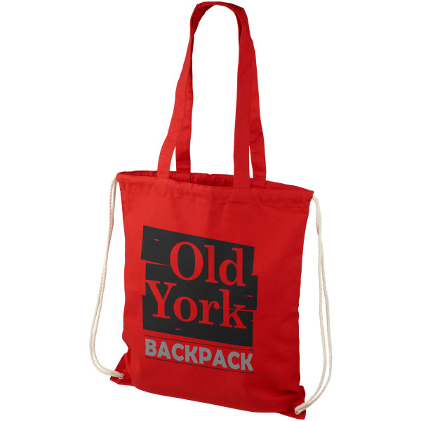 Bavlnená taška Eliza. Multifunkčná bavlnená taška s dlhými popruhmi a šnúrkou, ktorú možno nosiť ako tašku alebo batoh. Veľké hlavné oddelenie s uzatváracím mechanizmom. 240 gsm bavlna.