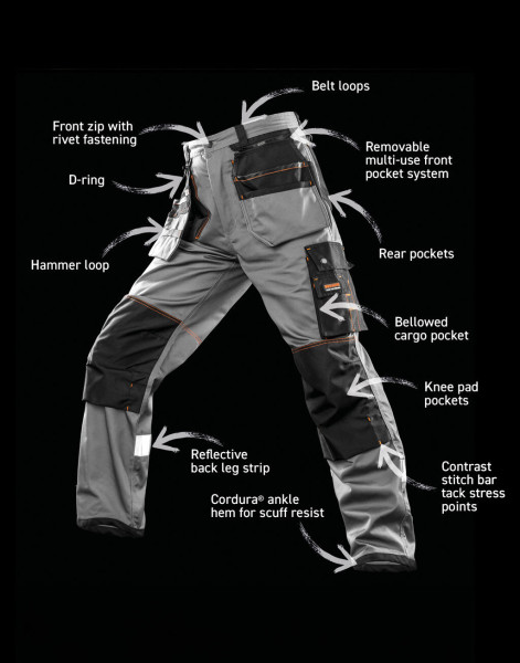 ·270 g/m² ·65% polyester, 35% bavlna (keper) ·vrecká: 100% polyester (600D Oxford) s PU povrchovou úpravou ·priedušné a nepremokavé ·zapínanie na zips a nit, pútka na opasok ·odnímateľné multifunkčné predné vrecká ·Cargo vrecká a zadné vrecká, pútko na kladivo, D-krúžky ·otvory na kolenačky ·kontrastné švy pre zosilnenie na namáhaných bodoch ·reflexné pásy vzadu ·zosilnený lem na členku Cordura® ·nadrozmerný strih