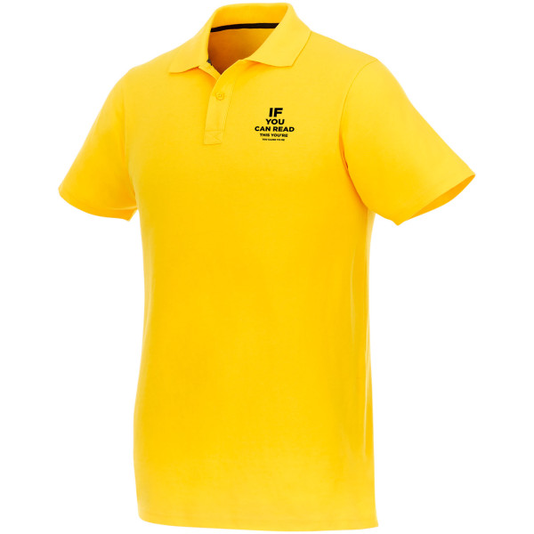 Pánska polokošeľa s krátkym rukávom Helios. Možnosť značenia vnútri. Odtrhávací štítok pre väčšie pohodlie. Plochý rebrový golier. Na dva gombíky. Dvojité stehovanie. Farebne ladené gombíky. Spevňujúce kontrastné lemovanie výstrihu. Piké úplet zo 100% bavlny. 180 g / m².