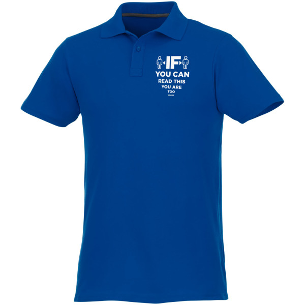 Pánska polokošeľa s krátkym rukávom Helios. Možnosť značenia vnútri. Odtrhávací štítok pre väčšie pohodlie. Plochý rebrový golier. Na dva gombíky. Dvojité stehovanie. Farebne ladené gombíky. Spevňujúce kontrastné lemovanie výstrihu. Piké úplet zo 100% bavlny. 180 g / m².