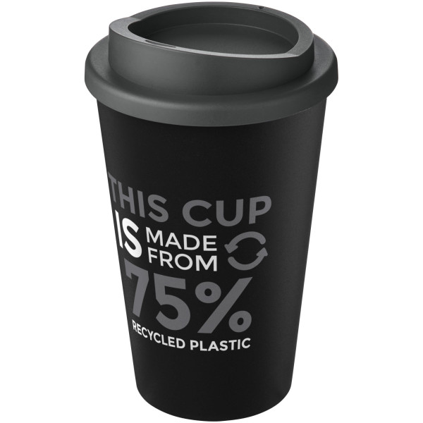 Americano Eco 350 ml recyklovaný pohár. Dvojstenný pohár s tepelnou izoláciou a nasadzovacím viečkom. Pohár je vyrobený zo 100% recyklovaného PP plastu, viečko je vyrobené z potravinárskeho PP plastu. Vzhľadom k tomu, že viečko nie je vyrobené z recyklovaného materiálu, možno ho objednať v širokej škále rôznych farieb. Odtieň čiernej farby poháru sa môže líšiť v závislosti na použitom recyklovanom materiáli. Objem 350 ml. Vyrobené v UK. Obal možno kompostovať v domácich podmienkach. Recyklovaný PP plast, PP plast.