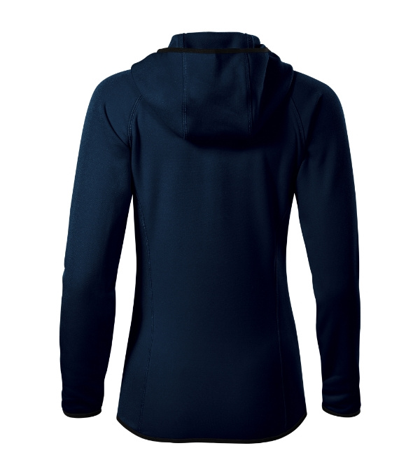 Hladký strečový rýchloschnúci materiál, ideálny pre šport a pohybové aktivity, strih tvarovaný bočnými dielmi, celozapínací reverzný špirálový zips, kapucňa s krytkou brady, vnútorný priekrčník začistený páskou, raglánové rukávy, vrecká na zips, lemovanie elastickým pásikom, tvarovaný a mierne predĺžený zadný diel, kontrastné prvky (okrem farby 01), etiketa v podobe odnímateľnej nálepky. Stretch fleece, 95 % micro polyester, 5 % elastan.