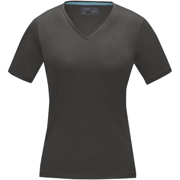 Dámske tričko Kawartha s krátkym rukávom, organická bavlna. Kolárik v rovnakej tkanine. Výstrih v tvare V. Stretchová látka. Detaily s vybraným stehom. Hodvábny prieramok. Potlač štítku technológiou heat transfer pre väčšie pohodlie. Jednolícny džersejový úplet, 95% biobavlna z prstencovej priadze a 5% elastan. 200 g / m².