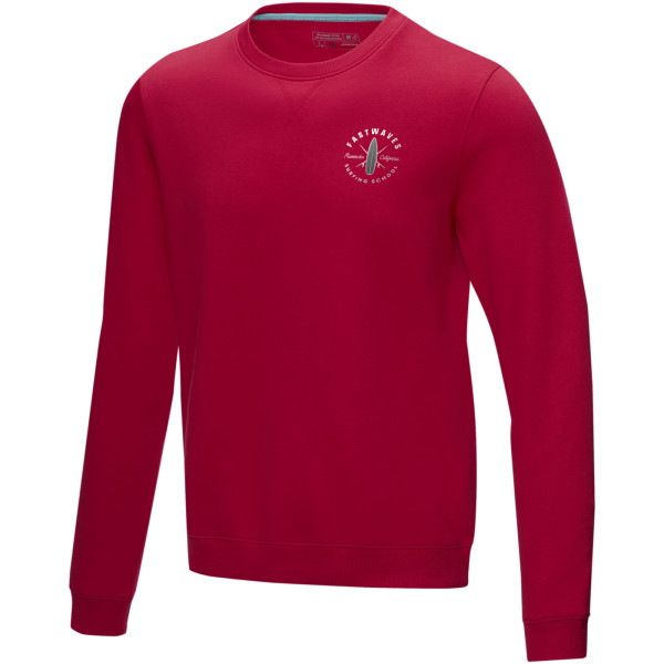 pánsky sveter s okrúhlym golierom z organického materiálu GOTS a recyklátu GRS. Udržateľné propagačné odevy. Okrúhly výstrih. Rebrový úplet v-vložiek vpredu na strede. Načesané na vnútornej strane. Rebrový úplet goliera. Rebrový úplet manžetiek. Rebrový úplet spodného lemu. Dvojfarebná značková páska na krk. Sedlo. Potlač štítku technológiou heat transfer pre väčšie pohodlie.
