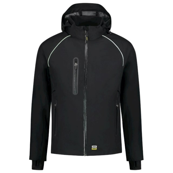 Vodeodolný, vetruodolný a priedušný materiál, rovný strih s bočnými švami, podšívka zo sieťoviny, odnimateľná kapucňa, kapucňa a dolný lem na stiahnutie elastickou šnúrkou, celozapínací vodeodolný zips YKK s krytkou brady, ventilácia v podpazuší na zips, manžety s otvorom pre palec, vrecká na zips YKK, podlepené švy, reflexné prvky, certifikácia podľa noriem EN 343:2019 (trieda 4:3) , Tricorp číslo produktu: 402018, . Plátnová väzba, 100 % polyester.