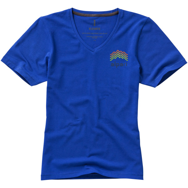 Dámske tričko Kawartha s krátkym rukávom, organická bavlna. Kolárik v rovnakej tkanine. Výstrih v tvare V. Stretchová látka. Detaily s vybraným stehom. Hodvábny prieramok. Potlač štítku technológiou heat transfer pre väčšie pohodlie. Jednolícny džersejový úplet, 95% biobavlna z prstencovej priadze a 5% elastan. 200 g / m².