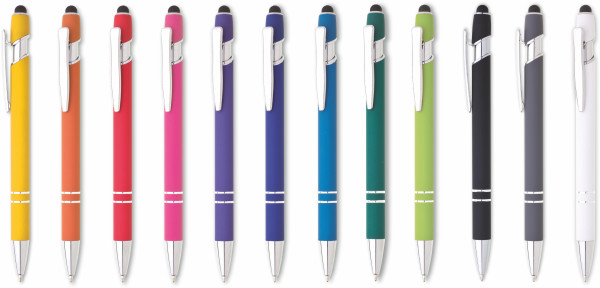 Guľôčkové pero kovové NATIO SOFT s hrotom pre ovládanie dotykovej obrazovky. Povrch farebného pera je pogumované so striebornými doplnkami. Modrá náplň X-20.