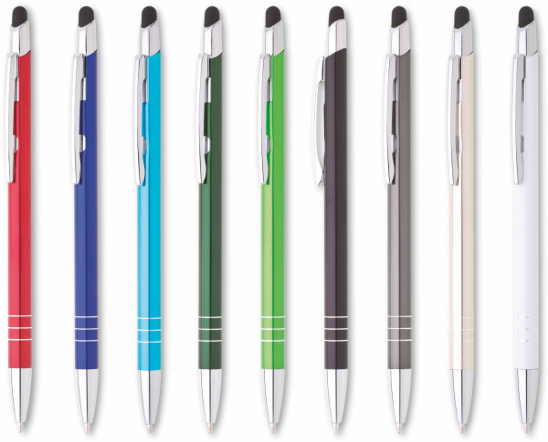 Tenké kovové guľôčkové pero SOTTI TOUCH s hrotom pre ovládanie dotykovej obrazovky má farebné telo a chrómové doplnky. Modrá náplň X20.
