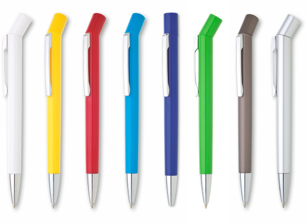 Guľôčkové pero GIO s netradičnou mechanikou zapínania. Plastové telo, strieborné doplnky. Kolekcia DESIGN.