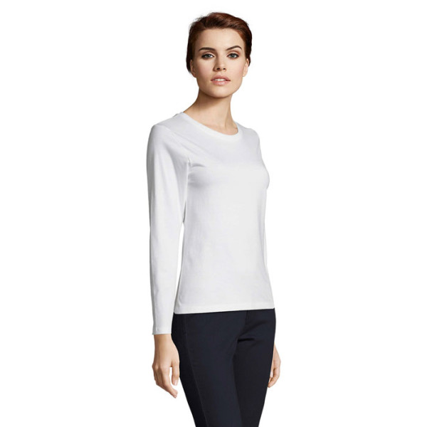 Dámske tričko Imperial 190 g. Rebrovaný golier. Dlhé rukávy. Strih a šitie. Priliehavý strih. Páska vo vnútri goliera. Podrobnosti o látke: Materiál: 100% poločesaná krúžkovaná bavlna. OEK0-TEX. Predáva sa iba s potlačou.