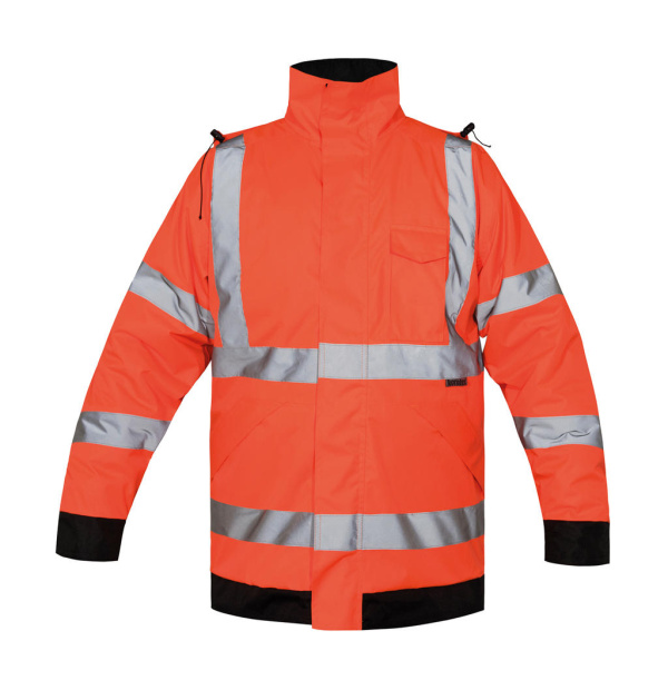 ·100% polyester ·skrytá nastaviteľná kapucňa ·vnútorný golier, manžety a spodný lem v čiernej farbe ·zapínanie na zips s vonkajšou príklopkou so zapínaním na suchý zips ·náprsné vrecko so zapínaním na suchý zips ·prekryté bočné vrecká ·reflexné vertikálne a horizontálne pruhy (šírka 5 cm) na prednej a zadnej strane ·EN ISO 20471 ·EN 343 ·RIS-3279-TOM Iss 2 (len pre farbu Orange)