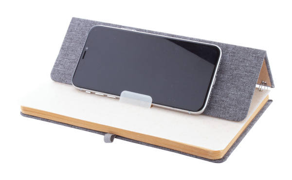 Spirálový nblok A5 s deskami potaženými polyesterem RPET s plastovým držákem na mobil a tablet z pšeničné slámy. Se 70 linkovanými listy z recyklovaného kraftového papíru, gumičkou a držákem na pero.