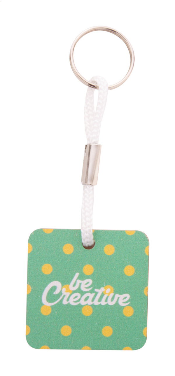 Čtvercový přívěsek na klíče z březové překližky s barevným polyesterovým páskem a plnobarevným potiskem. Cena je včetně UV LED tisku na jedné straně, nezahrnuje tiskovou přípravu. Min. mn.: 200 ks.