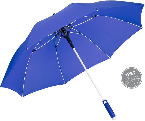 Pohodlná automatická funkcia pre rýchle otváranie, vysoko kvalitný vetruodolný systém pre maximálnu flexibilitu rámu v búrlivých podmienkach, flexibilné sklolaminátové rebrá v bielej farbe, stabilný oceľový hriadeľ s bielym plastovým puzdrom, polyesterový pongee krycí materiál vyrobený z recyklovaných plastov, biele plastové hroty, tvarovo mäkká rukoväť s integrovaným uvoľňovacím tlačidlom a možnosťou reklamného označenia. ​