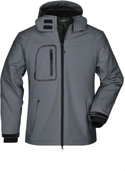Módna zimná softshellová bunda James & Nicholson pre mužov. Vonkajší materiál: 95% polyester, 5% elastan, Podšívka: 100% polyester, 3 vrstvy funkčnej tkaniny s TPU membránou, Vetru a vode odolná (5.000 mm vodného stĺpca), priedušná, odnímateľná, polstrovaná a lemovaná kapucňa, teplý fleecový golier , Zip pod rukávmi pre ďalšiu ventiláciu, Reflexné lemovanie na ramenách a prednom vrecku , 2 predné vrecká, 1 náprsné vrecko, vnútorné náprsné vrecko a vrecko na mobil , 2-pásmový zips , Elastická šnúra so zarážkami na páse a kapucni 1/10 , (ks v jednom sáčku / celkom ks v kartóne)