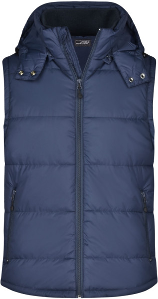 Prešívaná módna pánska vesta James & Nicholson s odnímateľnou kapucňou, vonkajší materiál: 100% Polyamide, Vnútorný materiál: 100% polyester, Vypchávka: 100% polyester, Vetru a vode odolná (600 mm vodného stĺpca), 2 predné vrecká, náprsné vrecko a vnútorné vrecko na mobil, elastická šnúra so zarážkami na kapucni a spodnom leme Balenie: 1/20 , (ks v jednom sáčku / celkom ks v kartóne)