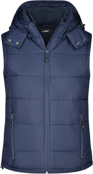 Módna dámska prešívaná vesta James & Nicholson s odnímateľnou kapucňou., vonkajší materiál: 100% Polyamide, Vnútorný materiál: 100% polyester, Polstrovanie: 100% polyester, Vetru a vode odolná (600 mm vodného stĺpca), 2 predné vrecká, náprsné vrecko a vnútorné vrecko na mobil, elastická šnúra so zarážkami na kapucni a spodnom leme, Mierne zúžená Balenie: 1/20 , (ks v jednom sáčku / celkom ks v kartóne)