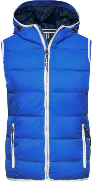 Módna vesta s kapucňou v dizajne pre yachting, Matný povrch s vrstvou odpudzujúcou vodu, Vode a vetru odolná (600 mm vodný stĺpec), 2 vrecká na zips, náprsné vrecko, zapínanie až ku krku, zipsy a doplnky sú v kontrastnej farbe, elastické prieramky, Balenie: 1/20 , (ks v jednom sáčku / celkom ks v kartóne)