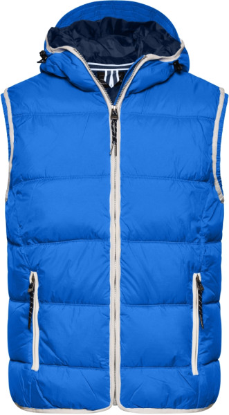 Módna vesta s kapucňou v dizajne pre yachting, Matný povrch s vrstvou odpudzujúcou vodu, Vode a vetru odolná (600 mm vodný stĺpec), 2 vrecká na zips, náprsné vrecko, zapínanie až ku krku, zipsy a doplnky sú v kontrastnej farbe, elastické prieramky, Balenie: 1/20 , (ks v jednom sáčku / celkom ks v kartóne)