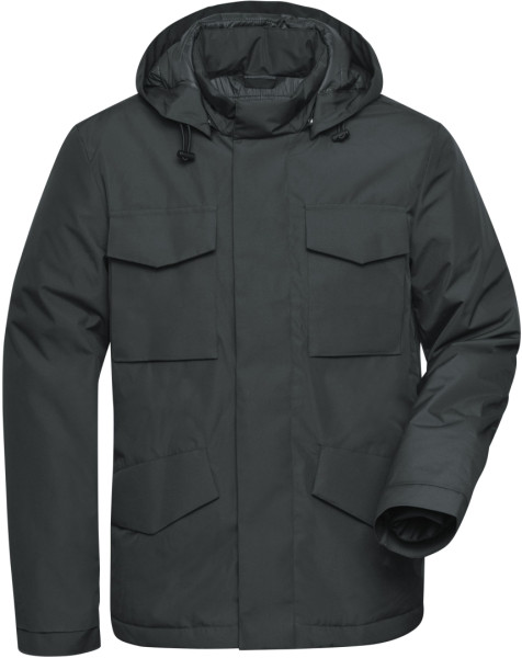 Business zateplený kabát v peknom dizajne, Vode a vetru odolný (5 000 mm vodný stĺpec), Paropriepustnosť je 1 500 g/m2/24hod, Stojací golier, nastaviteľná a odopínateľná kapucňa, Hlavný zips je prekrytý chlopňou, 2 predné vrecká, 2 šité vrecká na prsiach a jedna vnútorná na zips, Elastické šnúrky na bokoch, Zvnútra zips na zadnom diele pre ľahšiu výšivku, Zipsy sú značkové - YKK, 1/25 (ks v jednom sáčku / celkom ks v kartóne)