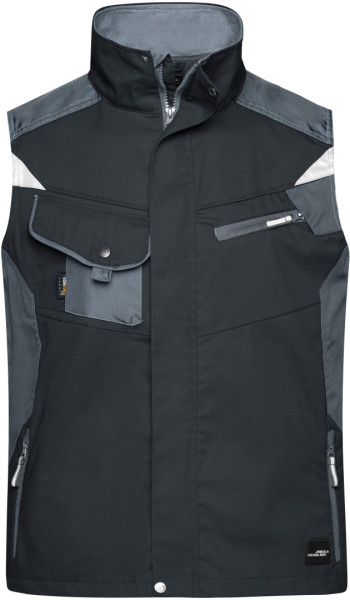 Pánska pracovná vesta James & Nicholson Workwear Vest, Profesionálna vesta s vysokou kvalitou vybavenia, Vonkajšia látka: 65% polyester, 35% bavlna, Vonkajší materiál 2: 100% polyamid, Robustná a odolná zmesová tkanina, Stojací golier s mäkkým rúnom vo vnútri, Ramenná časť vystužená Cordura predný zips s veternou ochranou, Priestranné vetracie otvory na zadnej strane, Bočné vrecká, náprsné vrecko a vnútorné vrecko na zips, Náprsné vrecko s chlopňou, vrecko na mobilný telefón vo vnútri, Reflexné prvky na prednej a zadnej strane, Balenie: 1/20 (ks v jednom sáčku / celkom ks v kartóne) ​