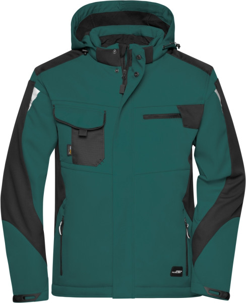 Robustná softshellová bunda vode a vetru odolná (2.000 mm vodný stĺpec), Priedušná a paropriepustná (2.000 g/m2/24h), Vnútri golier s fleecom na rube, Odnímateľná, nastaviteľná kapucňa, Ramenná časť vystužená materiálom CORDURA, Ochranná chlopňa na zips, teplé vnútorné manžety pri rukávoch, Bočné vrecká na zips, náprsné vrecko a vnútorné vrecko, Náprsné vrecko s chlopňou, vnútri vrecko na mobilný telefón, Reflexné prvky na rukávoch a na chrbte, Balenie: 1/10 (ks v jednom sáčku / celkom ks v kartóne)
