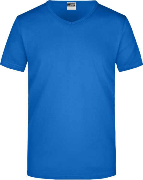 Zúžené pánske tričko James & Nicholson s výstrihom do V, Vonkajší materiál: 100% Bavlna, Predpraná tkanina drží tvar, Zúžený padnúci tvar s bočnými švami, Výstrih do V, Hmotnosť: 160 g/m2, Balenie: 10/100 (ks v jednom sáčku v kartóne)