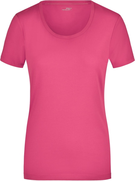 Elastické dámske tričko James & Nicholson s okrúhlym výstrihom, vonkajší materiál: 95% Bavlna, 5% Elastan, Mäkká elastická tkanina, Hlboký výstrih, Voľný strih, Nová dĺžka: Veľkosť M 64 cm, Hmotnosť: 160-170 g / m2, Balenie: 10/5 (ks v jednom sáčku / celkom ks v kartóne) ​