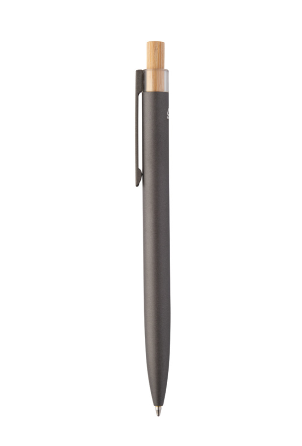 Guľôčkové pero z recyklovaného hliníka s bambusovým tlačidlom. S modrou náplňou.