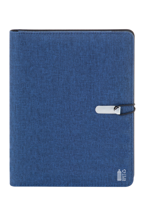 Polyesterová zložka na dokumenty veľkosti A5 z 300D RPET so 64 linkovaným poznámkovým blokom a niekoľkými vnútornými vreckami s organizérom.
