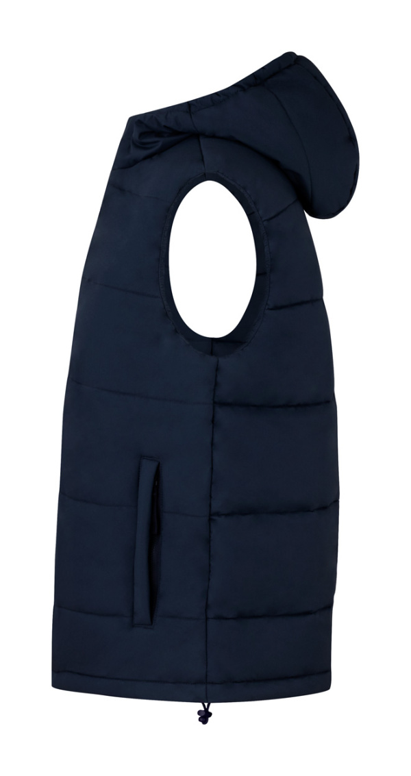 Vetru a vode odolná, vatovaná vesta s dvojitým predným zipsom a gombíkom. S kapucňou a bočnými vreckami. 100% polyester.