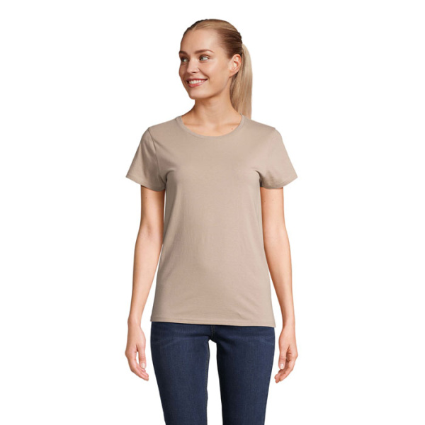 Dámske tričko z bio bavlny. Ľahko vypasovaný strih, okrúhly výstrih z rebrovaného úpletu, krčná lemovka, neutrálne veľkostnej štítok. Materiál: 150 g/m², 100% OCS certifikovaná bio bavlna, OEKO-TEX.