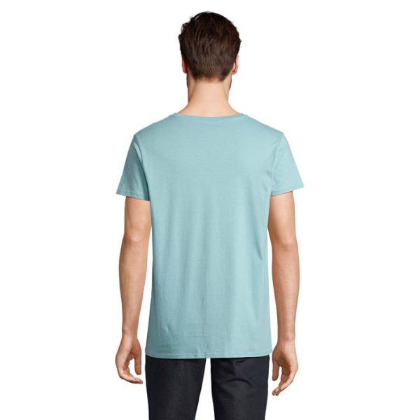 Pánske tričko z bio bavlny. Okrúhla pletenina, okrúhly výstrih z rebrovaného úpletu, krčná lemovka, neutrálny veľkostný štítok. Materiál: 150 g/m², 100% OCS certifikovaná bio bavlna, OEKO-TEX.