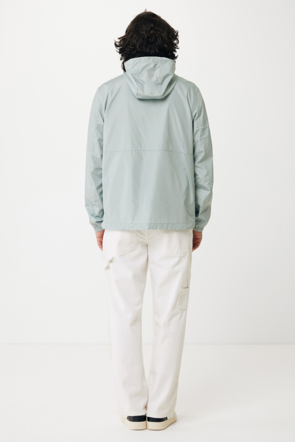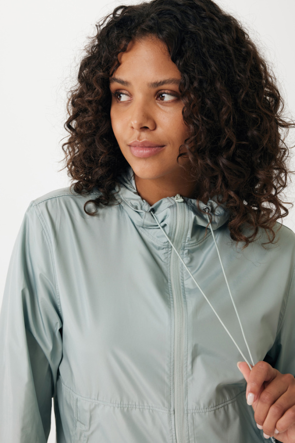 Unisex ľahká bunda vo voľnom strihu vyrobená zo 100 % recyklovaného polyesteru z použitých PET fliaš, 70 g/m². Má nastaviteľnú kapucňu s elastickou šnúrkou, reverzný zips vpredu a vrecká v bočných švoch. Všetky zipsy majú farebne zladené ťaháčiky pre elegantný vzhľad. Manžety sú plne elastické. Zadná časť bundy je mierne predĺžená a zaoblená, spodný lem má elastickú šnúrku so stoppermi pre lepšiu ochranu. Impregnácia bez fluóru/PFAS. Použitie skutočne recyklovaných materiálov je zaručené vďaka AWARE™ traceru a blockchain technológii. Po naskenovaní QR kódu získaš prístup k digitálnemu pasu produktu. 2 % z výťažku z každého predaného produktu budú venované organizácii Water.org. Produkt má certifikát OEKO-TEX® STANDARD 100.