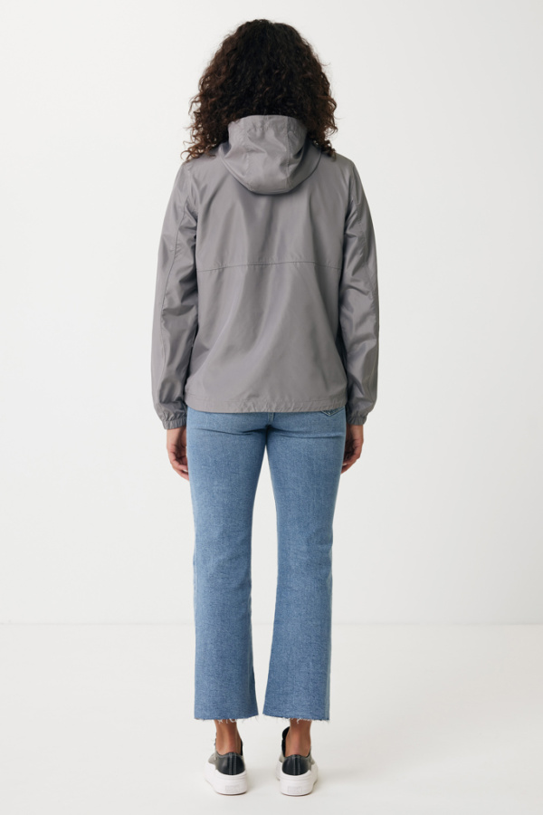 Unisex ľahká bunda vo voľnom strihu vyrobená zo 100 % recyklovaného polyesteru z použitých PET fliaš, 70 g/m². Má nastaviteľnú kapucňu s elastickou šnúrkou, reverzný zips vpredu a vrecká v bočných švoch. Všetky zipsy majú farebne zladené ťaháčiky pre elegantný vzhľad. Manžety sú plne elastické. Zadná časť bundy je mierne predĺžená a zaoblená, spodný lem má elastickú šnúrku so stoppermi pre lepšiu ochranu. Impregnácia bez fluóru/PFAS. Použitie skutočne recyklovaných materiálov je zaručené vďaka AWARE™ traceru a blockchain technológii. Po naskenovaní QR kódu získaš prístup k digitálnemu pasu produktu. 2 % z výťažku z každého predaného produktu budú venované organizácii Water.org. Produkt má certifikát OEKO-TEX® STANDARD 100.