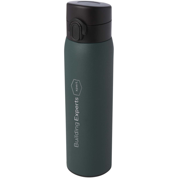 Štýlová termoska z recyklovanej nerezovej ocele s certifikáciou RCS a mechanizmom ľahkého otvárania tlačidlom. Termoska je nepriepustná a vďaka vákuovej medenej izolácii nápoja vydrží horúce alebo studené niekoľko hodín. Objem je 450 ml. Dodáva sa v darčekovej krabičke z recyklovanej lepenky.