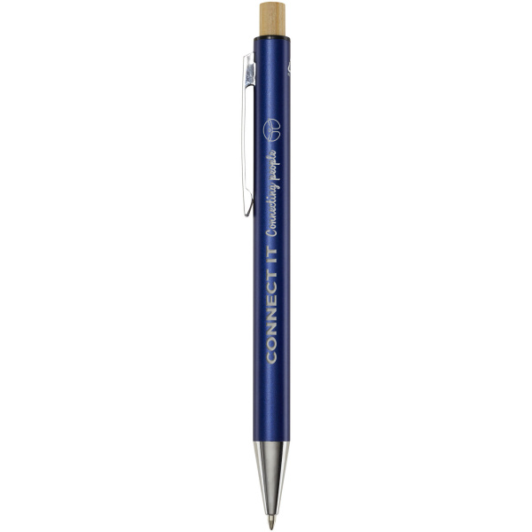 Guľôčkové pero Cyrus je vyrobené z recyklovaného hliníka, čo si vyžaduje menej energie ako výroba hliníka z nerastných surovín. Znižuje tiež množstvo odpadu na skládkach a pomáha šetriť prírodné zdroje s cieľom znížiť emisie skleníkových plynov. Tlačidlo je vyrobené z bambusu. Farba atramentu: Modrá. Dĺžka písania: 800 metrov. Rozmer hrotu: 1,00 mm.