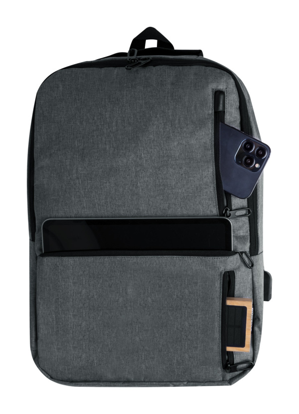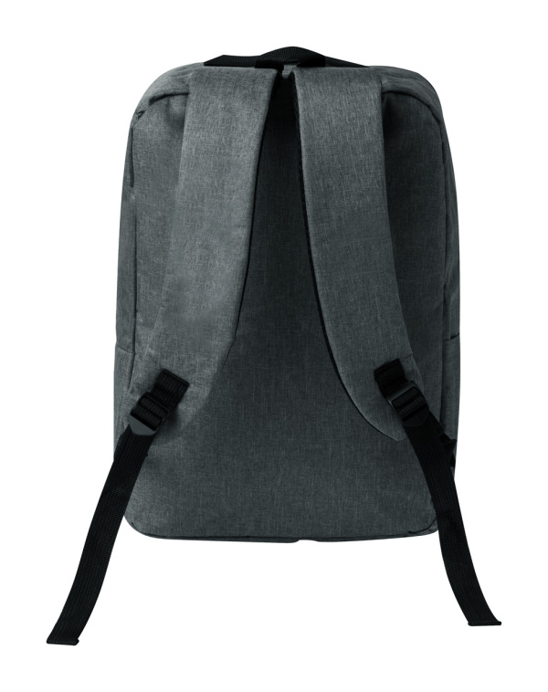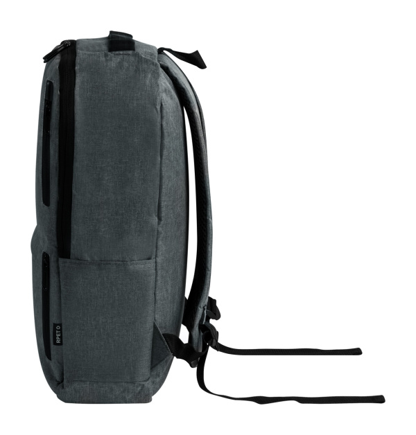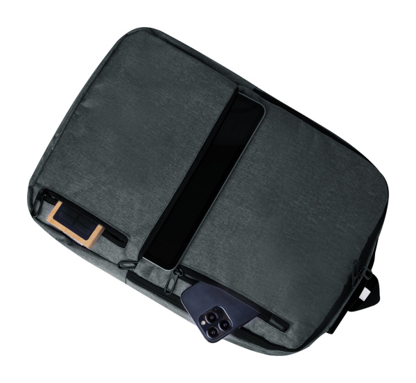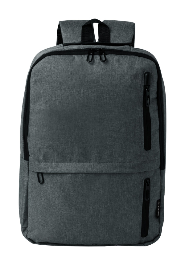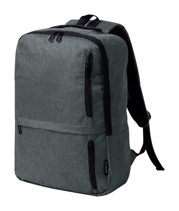 Batoh RPET s priehradkami na zips, polstrovanou priehradkou na notebook (15") a tabliet (10"), polstrovaný chrbát a ramenné popruhy. 600D RPET polyester s výrazným štítkom RPET.