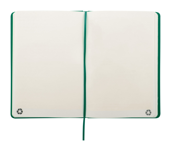 Blok A5 z recyklovanej PU kože so 100 čistými listami z recyklovaného papiera. So záložkou v zodpovedajúcej farbe a gumičkou.