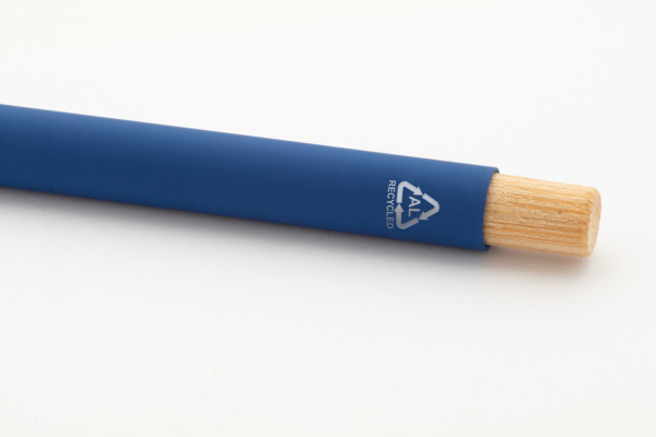 Guľôčkové pero z recyklovaného hliníka s pogumovaným povrchom a bambusovým tlačidlom a chrómovými detailmi. So špeciálnou vrstvou na zrkadlové laserové gravírovanie. S modrou náplňou.