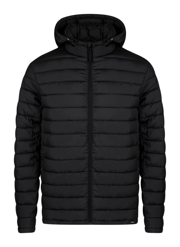Vetru a vode odolná polstrovaná bunda na zips s bočnými vreckami na zips a nastaviteľnou kapucňou. S polyesterovým puzdrom RPET. 100% RPET polyester s výrazným štítkom RPET.