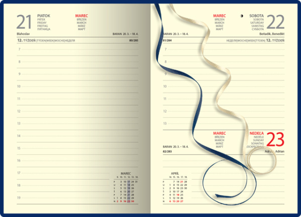 Obľúbený denný diár s prehľadným kalendáriom na každý deň. Diár je v pevnej väzbe s prednou penovou doskou, jednoduchý dizajn dopĺňa