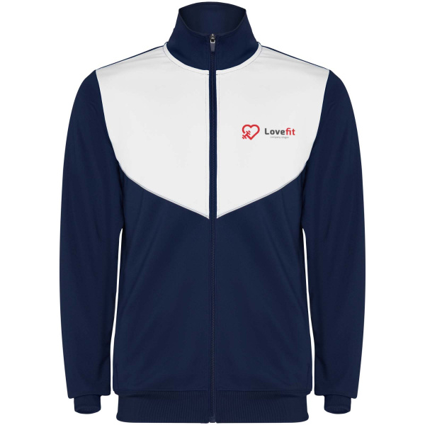 Tepláková súprava z ľahkej a elastickej látky. Bunda s kontrastnou farbou a našitým lemom na hrudi. Vysoký golier s kontrastnými švami. Stredový predný zips. Bočné vrecká. 2 × 2 rebrované manžety a pás. Nohavice s elastickým pásom a sťahovacou šnúrkou. Kontrastný bočný diel s našitým lemom. Lem na zips.