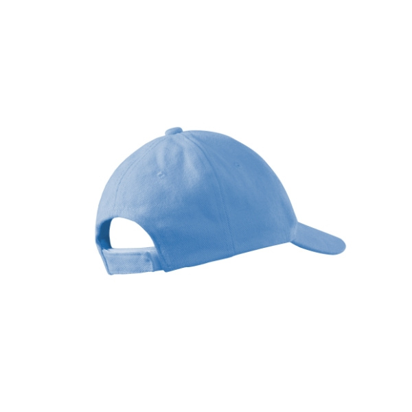 Šestpanelový strih, vystužené 2 predné panely, prešívaný, zlahka prehnutý šilt, obšité vetracie otvory, potiaca páska, velkost nastavitelná suchým zipsom. Brúsený keper, 100 % bavlna.