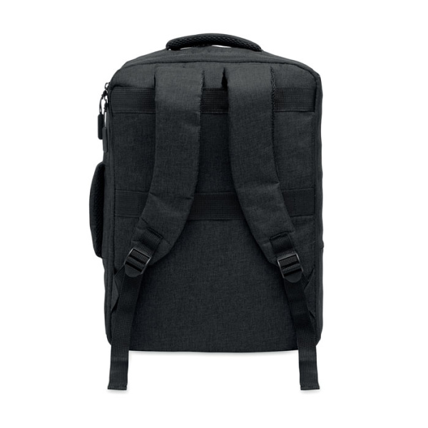 Batoh na 15-palcový notebook z materiálu 300D RPET a podšívkou z materiálu 210D RPET. Obsahuje priehradku na notebook, 2 vnútorné vrecká na drobnosti, 2 vnútorné vrecká na perá a 2 polstrované uši na prenášanie. Mäkko polstrovaný chrbát a ramenné popruhy. Držiak na vozík.