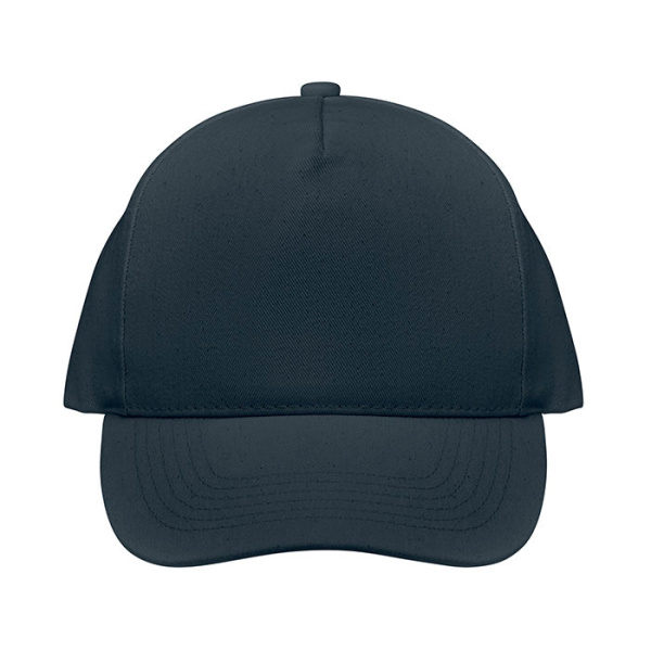 Päťpanelová baseballová čiapka z brúsenej organickej 250g bavlny s nastaviteľným pásikom a zapínaním na kovovú pracku vzadu. Štyri kovové odvetrávacie očká v rovnakej farbe.