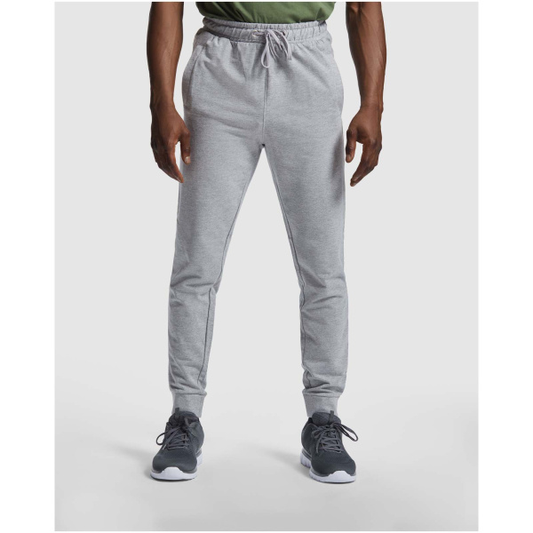 Športové nohavice so širokým nastaviteľným pásom, sťahovacou šnúrkou, priliehavými členkovými manžetami, zosilnenými švami, rebrovanými bočnými vreckami a zadným rohovým vreckom s prešitým priehľadom. Odnímateľný štítok.
