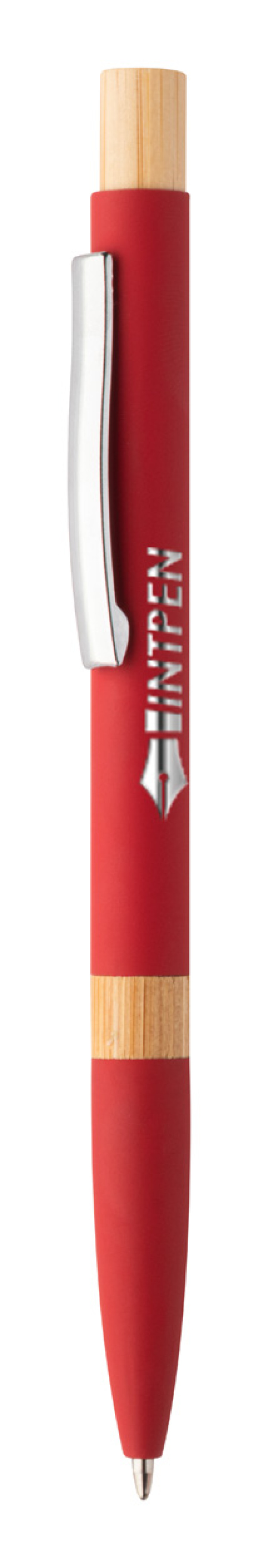 Guľôčkové pero z recyklovaného hliníka s bambusovými časťami, pogumovaným povrchom a chrómovým klipom. So špeciálnou vrstvou na zrkadlové laserové gravírovanie. S modrou náplňou.