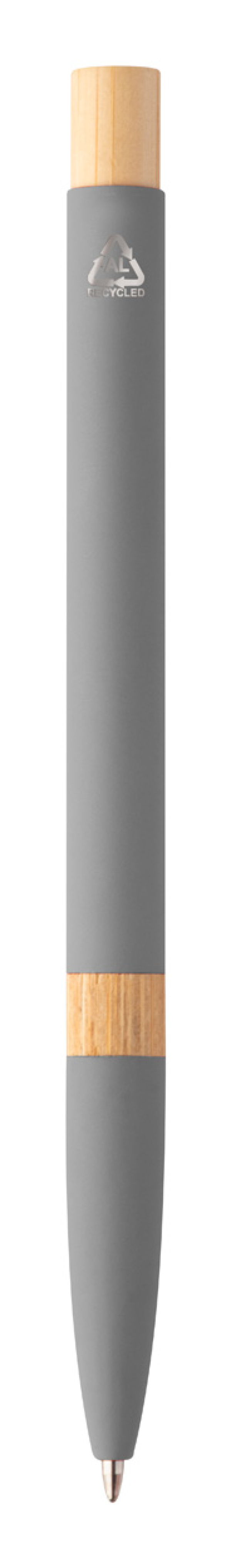 Guľôčkové pero z recyklovaného hliníka s bambusovými časťami, pogumovaným povrchom a chrómovým klipom. So špeciálnou vrstvou na zrkadlové laserové gravírovanie. S modrou náplňou.