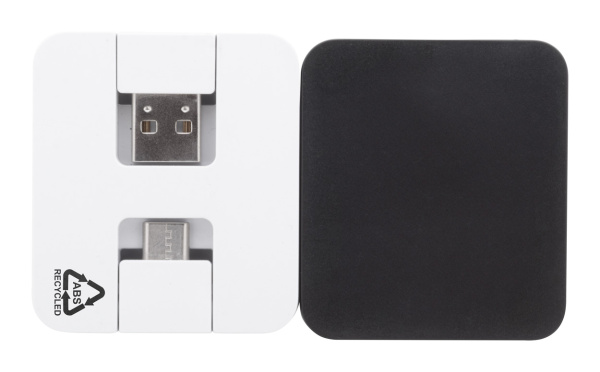 USB hub vyrobený z recyklovaného ABS plastu s 2 USB a 2 USB-C portami. So sklopnými konektormi USB a USB-C. USB 2.0.